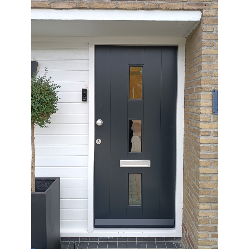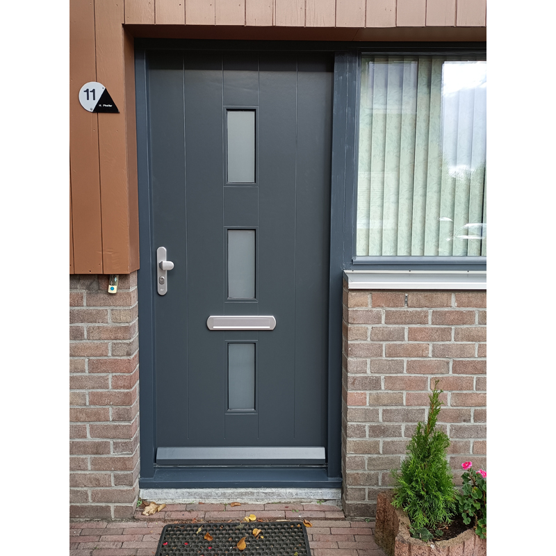 Deze moderne JDT voordeur heeft in het midden drie verticale ruiten en is afgewerkt met verticale freeslijnen die over de gehele deur zijn aangebracht. Dankzij de AluTherm-opbouw combineert de deur een verfijnde uitstraling met duurzaamheid en uitstekende isolatiewaarden.