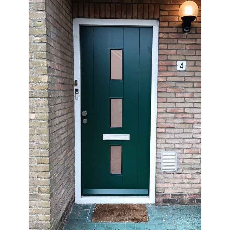 De deur is gemaakt van een alutherm plaat. Deze plaat is opgebouwd uit twee dekplaten van meranti met een kern vulling van geëxtrudeerd polystyreen vulling (XPS). Daarnaast heeft de deur twee aluminium lagen die zorgen voor minder werking van de deur en vocht niet kan doorslaan.